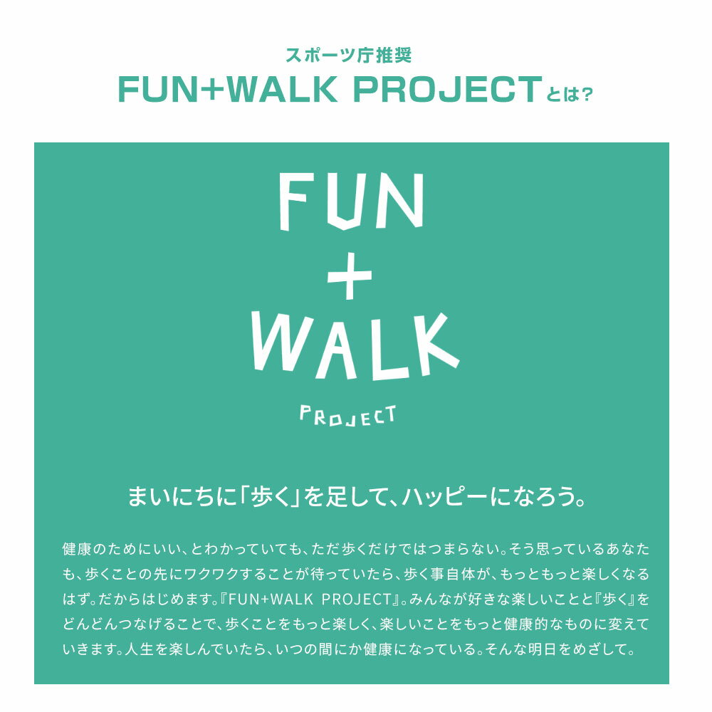 スポーツ庁推奨『FUN+WALK PROJECT』 FUN+WALK PROJECTは、 歩くことをもっと楽しく、楽しいことをもっと健康的なものにする「歩く」を入口に、国民の健康増進を目指しています。